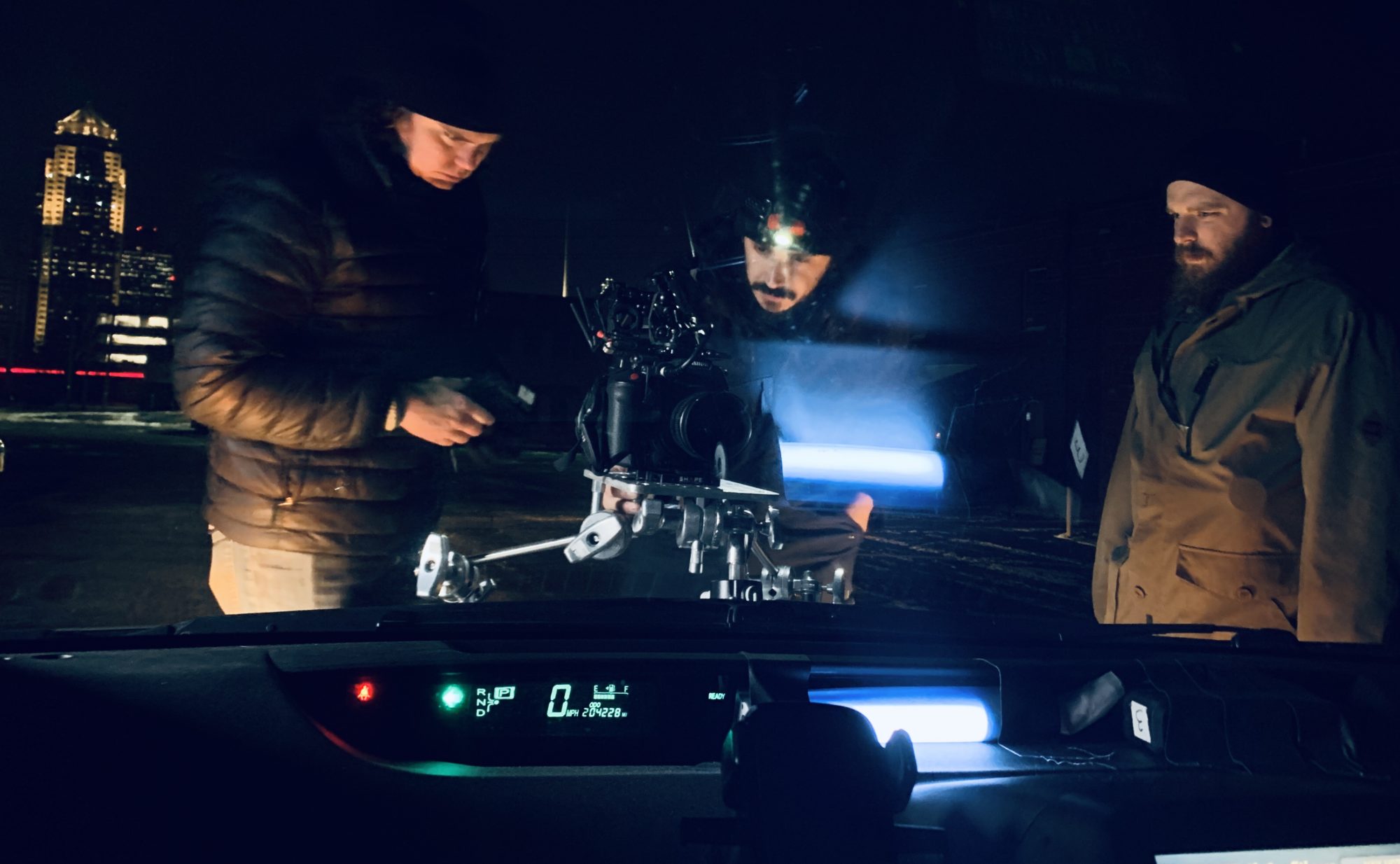 - Director of photography Bruce James Bales attaches a camera to the hood of a car